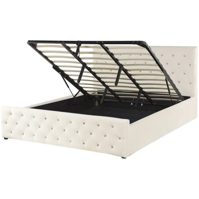 General description Upholstered Bed Frame with Ottoman Storage. A perfect bed is crucial for a good night's rest; this one offers not only comfort but also an elegant, upscale look. Its metal frame is covered with upholstery fashioned from soft and silky velvet fabric in a neutral light beige color. The piece features a headboard and footboard decorated with a subtle tuft and radiant faux crystals for a glamorous touch. The bed comes with ottoman storage that will easily fit all your sheets and bedroom accessories. Technical specifications Product Type: Double Bed Style: Glam General Color: Beige Shade: Light Beige Main Material: Velvet Material Composition: 100% Polyester Fabric Storage Type: Ottoman Dimensions: Headrest Dimensions: 191x107 cm Width: 191 cm Storage Dimensions: 182x202 cm Length: 217 cm Height: 109 cm Sleeping Surface: 180x200 cm Weight: 58 kg Weight Capacity: 200 kg Assembly Time: 45-60 min Usage The height of the mattress shown in the picture is 20 cm; it is