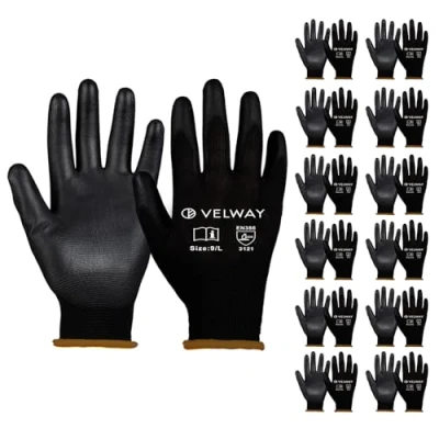 Velway 12 Pairs Safety Work Gloves Firm Grip Gardening Non Slip PU Coated Builders Lightweight Breathable Protective EN388 Mechanic Working for Men Women Black (Size 9/L)