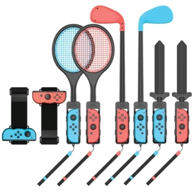 8-piece joy-con controller attachments for use with Nintendo Switch sports and other motion sensitive games Includes 2 x Tennis Racket, 2 x Golf Club, 2 x Sword and 2 Leg Strap attachments Offers added realism as well as a more intensive workout when playing motion sensor sports games All attachments retain access to all joy-con controller buttons and controls Includes safety wrist straps to for added security and to prevent unexpected flying controllers, Platforms: Nintendo Switch