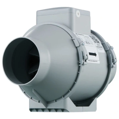 General description The Inline Fan Vents TT Pro 100 T is designed for efficient ventilation in both residential and commercial properties. It is particularly effective for air extraction in damp rooms, providing high pressure and low noise levels. Technical specifications Voltage: 220-240 V ~ 50/60 Hz Housing colour: grey Housing material: robust, flame-retardant polypropylene Nominal size: 100 mm Wattage: 25 W Current consumption: 0.11 A Revolutions per minute: 2620 Airflow rate: 245 m³/h Sound pressure Lp-3m: 32 dB(A) Height: 226 mm Width: 195.8 mm Length: 302.5 mm Diameter duct connection: 97 mm Max. temperature for continuous operation: 60°C IP code: IPX4 Weight: 1.75 kg Other information Adjustable shut-off timer (2 - 30 min): fan turns off after expiration of the pre-set time Ball-bearing motor Mounting options: any position Motor unit can be removed quickly and easily for cleaning and maintenance
