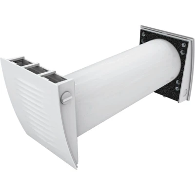 General description The TwinFresh Easy ventilation system is designed for efficient single room ventilation with heat recovery. It features a ceramic reservoir that maximizes heat retention, ensuring a comfortable indoor climate while minimizing energy loss. Technical specifications Operating voltage: 110-240 V ~ 50/60 Hz Nominal duct size: 160 mm Motor wattage: 1 / 2.1 / 4.3 W Current consumption: 0.017 / 0.025 / 0.041 A Revolutions per minute: 915 / 1555 / 2330 Airflow rate in ventilation mode: 15 / 30 / 50 m³/h Airflow rate in recovery mode: 8 / 15 / 25 m³/h Sound pressure level at 3m: 12 / 18 / 20 dB(A) Sound pressure level at 1m: 21 / 27 / 29 dB(A) Permissible temperature range of air: -15°C to +55°C Heat recovery efficiency: ≤ 92% Protection code: IP24 (splashing water protection) Protection class: II Weight: 8 kg Front panel dimensions: 215 x 250 mm Outer hood dimensions: 215 x 250 mm Telescopic tube dimensions: Ø 160 mm x 250 - 500 mm Compatibility and accessories Includes G3