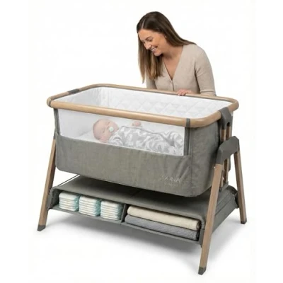 Adjustable Comfort for A Perfect Nights Sleep - Easily tailor the bedside crib to your bed height using its multiple adjustable positions, including an incline option that helps support easier breathing and digestion. This flexibility ensures your newborn rests safely and comfortably, right where you need them most. True Co-Sleeping Made Safe & Simple - The smooth dropside and secure attachment straps transform the crib into a reassuring co sleeper bassinet, keeping your baby close while maintaining safe sleep guidelines. It offers the connection of infant cosleeping without compromising the protective space your little one needs. Breathable Design With Premium Comfort - A soft, supportive mattress and premium breathable mesh side create a cozy yet airy space for your baby. The combination of airflow and plush fabrics keeps your newborn comfortable through every nap and nighttime stretch. Practical Storage for Nighttime Essentials - The convenient lower shelf keeps nappies, wipes, and blankets within arm’s reach, making nighttime care effortless. It turns your bedside infant bed into a tidy, organised hub for those early months. Modern Style, Zero-Tool Setup - Featuring a stylish fabric and wood-effect frame, this bedside cot crib complements modern bedrooms effortlessly, and the no-tool assembly keeps setup stress-free. Lightweight yet sturdy, it can be used as a standalone bassinet or securely attached as a cot for next to bed living.