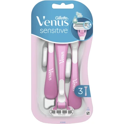 Venus Sensitive Disposable Razors (Pack of 3) are designed for women with sensitive skin, featuring 3 blades and SkinElixir lubricating strips for a smooth, irritation-free shave. The pivoting head adapts to body contours, offering a close, comfortable shave with up to 0% skin irritation.