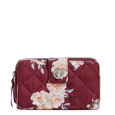 PERFORMANCE TWILL -- This weather-friendly, water-repellent fabric is durable & lightweight for everyday use EVERYDAY USE - Vera Bradley wallets are sleek & perfect for all of your cards, IDs, receipts, bills, coins, an other small essentials - & they make great gifts too SAFE & SOUND - Our sophisticated turnlock closure is designed to keep the contents of your wallet where they belong while also giving you easy access to your essentials - with RFID protection, your identity & cards are safe from theft PICK A CARD - The Turnlock Wallet comes with 12 card slips to keep you neat & organized, with a separate bill pocket for your cash & yet another slip pocket designed to fit your checkbook PERFECTLY SIZED - The Turnlock Wallet measures 8 wide & 5 inches high - featuring 1 zip exterior pocket with zip main pocket containing 12 card slips, bill pocket, slip pocket for your checkbook, & ID window