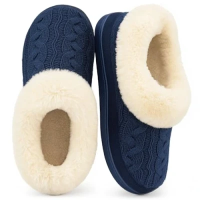 We strongly suggest you GET 1 SIZE UP for a more comfortable fitting. Due to the memory foam and thick fabric, these slippers might feel snug at first - just give them a couple of days to break in Signature moccasin house shoe with slip-on closed-back design. The skid-resistant and rugged sole provides indoor & outdoor versatility Comfort cable knit upper with micro suede trim and warm sheep cashmere collar adds an elegant and delicate touch to these slippers. A beautifully designed look will have you feeling stylish and comfy Flexible multilayer cloud cushion insole with memory foam footbed adds support that cradles the contour of your foot for a therapeutic fit. Helps alleviate sore and tired feet and foot pain associated with Plantar Fasciitis, Flatfeet, Talipes Valgus and Splayfeet Faux suede sidewall and durable rubber outsole provide secure footing. Easy to slide on for on-the-go or casual lifestyles; great for home, office, lounging, school, hospital and travel