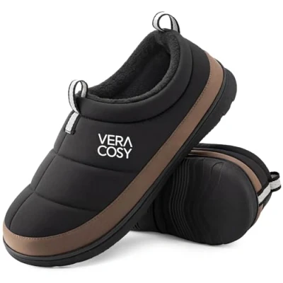 VeraCosy Men's Quilted Closed back Slippers Comfy Lightweight Memory Foam Camping Style Indoor House Shoes Ebony Black, 12 13 UK