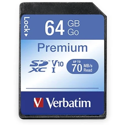 Premium SDXC memory card. Ideal for professional digital SLR cameras. UHS-I Speed Class 1 (U1) for 1080p Full HD video recording and burst photography. Read speed: up to 45 MB/s. Compact physical size: 32 x 24 mm. Capacity: 64GB. Colour: Black.