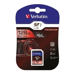 Premium SDXC memory card. Ideal for professional digital SLR cameras. UHS-I Speed Class 1 (U1) for 1080p Full HD video recording and burst photography. Read speed: up to 45 MB/s. Compact physical size: 32 x 24 mm. Capacity: 128GB. Colour: Black.