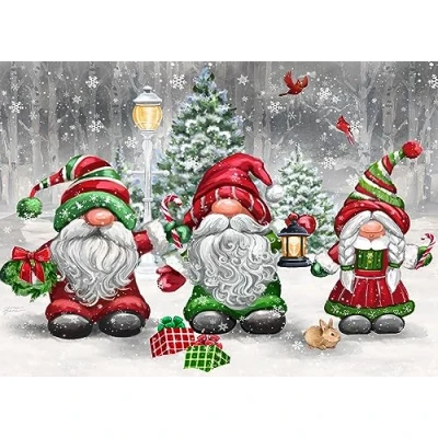 Box of 15 Christmas Cards / 16 Deluxe Foil Lined Envelopes. Printed in the U.S.A. on durable card stock. Christmas cards measure 4 1/2"x6 1/4" folded. Packed in an attractive red box. Inside Greeting: There's no place like gnome for Christmas! Have a magical holiday season and a happy new year.