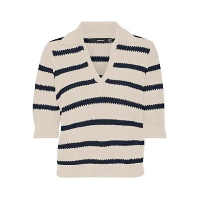 VERO MODA Women's Vmamazing 2/4 V Neck Polo Pullover Boo Knitted Jumper, Birch/Detail: w. Navy Blazer, M