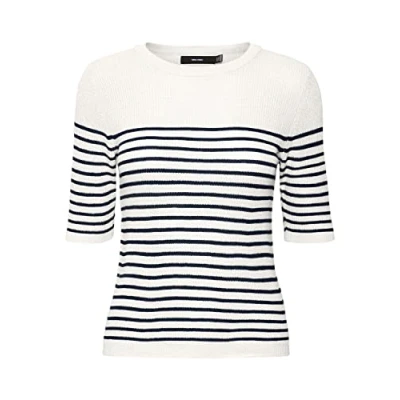 VERO MODA Women's Vmnewlexsun 2/4 Tight O Neck Blou Ga Rep Sweater, Snow White/Detail:w Navy Blazer Stripes, XS