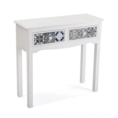 FEATURES - Perfectly sized hall table for entry or hallway. The console table has a height of 78 cm, with a length (depth) of 30 cm, and a width (from side to side) of 81 cm. The weight is 10,75 kg and is made of MDF wood and melamine, with ceramic tiled drawers. Colour: White and blue. Includes two drawers MULTIFUNCTIONAL - Ideal to place in a living room, office, bedroom or in the kitchen. It is multipurpose since you can use it as a bedside table, coffee table, for the telephone, for the TV, etc. STABLE - Its structure gives it great stability. You can also easily clean it with a damp cloth or glass cleaner; it is not porous so it will not become impregnated with dust MEDITERRANEAN STYLE - The Mediterranean concept of this console adapts to any decoration and style of home, so it will give a contemporary touch to any hall, entrance or room of the home. The harmony of the colour of the wooden countertop, the plain colour of the legs and the details on the drawers will provide the personality you are looking to incorporate into any room. Fits in trendy environments. Provides a unique character and personality EASY ASSEMBLY - Quick and easy assembly. Includes instructions. It is enough with one person and no additional tools are necessary for its assembly. You will have it ready in 5 minutes