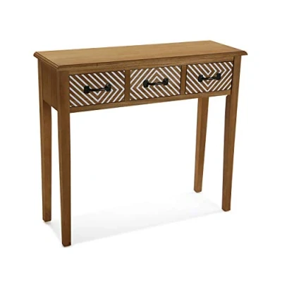 Features: table for the entrance area with a perfect size for the entrance or hallway. The practical console is 80 cm high, and has a length (depth) of 30 cm, and a width (from side to side) of 90.5 cm. The weight is 12 kg and it is made of metal pine wood and thrower made of metal. Color: brown and white Includes 3 drawers in different sizes Multifunctional – Due to its narrow design, the space-saving table is perfect for the entrance area, but also suitable for the hallway, living room, office or bedroom. It is very compact and does not take up much space. It is perfect for storing keys, decorating with a lamp and storing photos. Stable – thanks to its four legs, the table has high stability. You can clean the modern table with a damp cloth as it has a water-repellent surface made of high quality and long durability. It is non-porous and therefore the dust does not get stuck. Rustic style – the rustic concept of this console adapts to any decoration and décor and gives any hall, entrance or room of the house a modern touch. The contrast between the colours of the wooden worktop, the simple colour of the legs and the details of the drawers give you the personality you want to integrate into any room. They fit perfectly with the latest trends and offer a unique character Easy to assemble – quick and easy to assemble. Includes instructions It is enough with one person and no additional tools are required for assembly. You get it done in 5 minutes