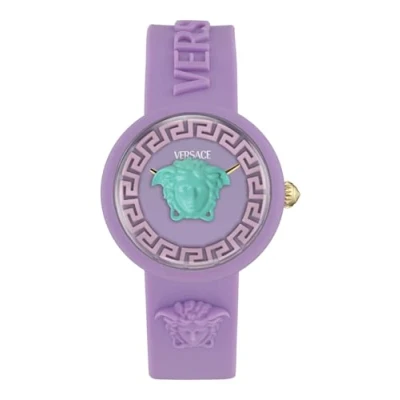 r kids is a playful 32mm watch, specially designed for kids who love to stand out. Featuring vibrant pop colors and a contrasting floating Medusa, this timepiece brings iconic style to every tick. This Analogue watch is equipped with a Swiss Made Movement High quality Purple Silicone strap, measuring 19 cm in length and 15 mm in width, with a Buckle Case diameter: 32 mm,case thickness: 11.4 mm, case colour: Purple and dial colour: Purple Water resistant: 3 bars-Weight: 50 g The watch is delivered in an original gift box and has a warranty of 2 years