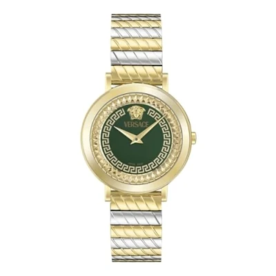 This collection merges heritage with modernity. The iconic case reflects Versace's accessory patterns, with a chain all over the inner ring giving the dial an interesting depth as well as the Greca on the dial. This Analogue watch is equipped with a Swiss Made Movement High quality Multicolour Stainless steel strap, measuring 19 cm in length and 16 mm in width, with a Deployment clasp Case diameter: 35 mm,case thickness: 7 mm, case colour: Multicolour and dial colour: Green The watch is delivered in an original gift box and has a warranty of 2 years