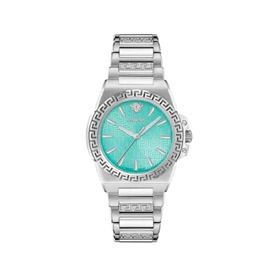 Versace introduces the Greca Reaction watch, a stunning timepiece tailored for the modern woman with its sleek 38mm case. Adorned with a textured pattern dial, it exudes sophistication and style. This Analogue watch is equipped with Luminous Hands and has a Swiss Made Movement High quality Silver Stainless steel strap, measuring 19 cm in length and 21 mm in width, with a Deployment clasp. Case diameter: 38 mm,case thickness: 10 mm, case colour: Silver and dial colour: Blue Water resistant: 5 bars-Weight: 120 g The watch is delivered in an original gift box and has a warranty of 2 years