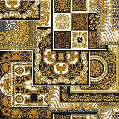 WallpaperDirectA collage of various panels: stucco sculpted tiles and ceiling roses; delicate metal lattices and gilded frames - all exude the essence of Versace. A wide-width wallpaper.