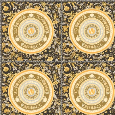 Iconic Versace design teeming with opulence and flamboyant flourishes. This wide width vinyl wallcovering features a circular motif, with the Versace logo and brand name at its centre. Tropical flowers and a square border frame the pattern. Shown here with black and gold details.