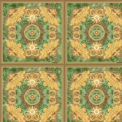 A wide width vinyl wallpaper featuring an iconic Versace design, enclosed within a large tile. Leopard and tiger print, jungle palm leaves and gold baroque swirls give this pattern a feeling of opulence and luxury. Shown here with vibrant green, brown and gold details.