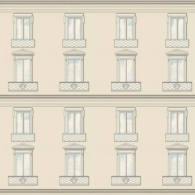 Palazzo No 12 echoes the architecture of villas and palaces: window illusions, column motifs, lattice structures and colonnade elements bring depth and perspective into play. The motifs transform walls into façades. With subtle colour gradations and delicate gloss effects, this series creates an elegant aura between the interior and the classic exterior façade. This is a wide width Italian vinyl wallpaper.