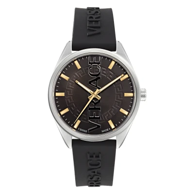 This Versace V-vertical Analogue Watch for Men is the perfect timepiece to wear or to gift. It's Silver 42 mm Round case combined with the comfortable Black Silicone watch band will ensure you enjoy this stunning timepiece without any compromise. Operated by a high quality Quartz movement and water resistant to 5 bars, your watch will keep ticking. This high quality watch is an incredible eye-catching Men watch. This Analogue watch has a function: Luminous Hands and has a Swiss Made Movement High quality 21 cm length and 19 mm width Black Silicone strap with a Buckle Case diameter: 42 mm,case thickness: 9 mm, case colour: Silver and dial colour: Black