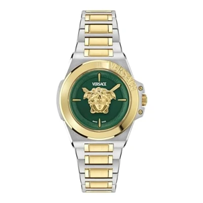 A new shaped case for a timepiece that celebrates the beauty and the charm of the Medusa floating on dial. This Analogue watch has a Swiss Made Movement High quality 19 cm length and 23 mm width Multicolour Stainless steel strap with a Deployment clasp Case diameter: 38 mm,case thickness: 12 mm, case colour: Multicolour and dial colour: Green Water resistant: 5 bars-Weight: 130 g The watch is delivered in an original gift box and has a warranty of 2 years