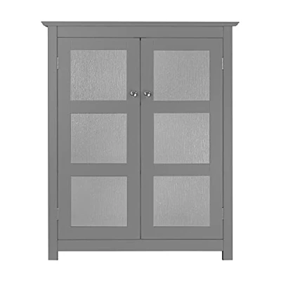 STYLE: Features a timeless grey finish with double-plated knobs and 2 doors paneled with modern, water-textured glass for a beautiful addition to your space DESIGN: This floor cabinet has double doors with two inner shelves, one fixed and one adjustable. Allowing a lot of extra storage room for soaps, shampoos, towels, toiletries, and more but taking up little to no bathroom space DURABILITY: Crafted with quality MDF, making the cabinet extremely durable and stable. ASSEMBLY: Easy, step-by-step instructions and all of the hardware needed for installation are included for quick assembly DIMENSIONS: Measures 86.4 x 66 x 34.9 cm to provide accessible storage without taking up too much space in your living area or bathroom