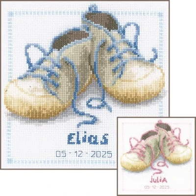 Vervaco Baby Cross Stitch Kit Wall Art Approx. 19 x cm Pink/Blue Lace Shoes DIY Crafts Adults Decoration Full Birth Gift