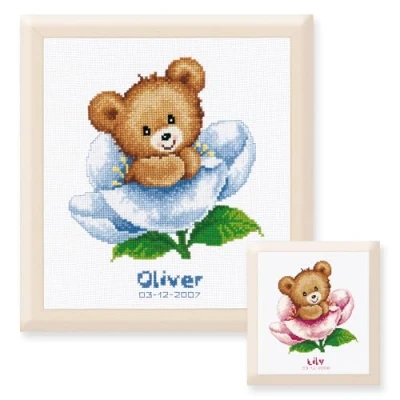 Design to be stitched with pre-sorted cotton threads onto white, cotton, 14 count aida. Kit contains both blue and pink thread. Finished size is approximately: 20 x 22cm or 8 x 8.8in. 20 x 22cm Birth Record