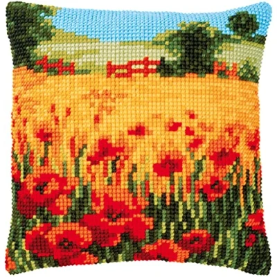 Vervaco Cross Stitch Embroidery Kits Cushion Set Beginners Pre Printed Poppies Landscape DIY Creative for Adults 40 x cm Craft Kit Craftsman Home Decoration