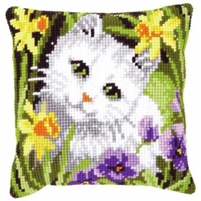 Vervaco Cross Stitch Kit: Cushion: White Cat in Daffodils, Cotton, NA, 40 x 40cm