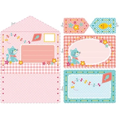 3 invitation cards and two tags. Designs to be stitched in thick acrylic yarn onto printed carton. Kit includes a plastic needle.
