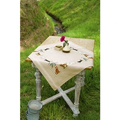 Printed design to be stitched with pre-sorted cotton threads onto beige cotton fabric with hemmed in woven border. Finished size approximately: 80 x 80cm, 32 x 32in. 80 x 80cm Tablecloth
