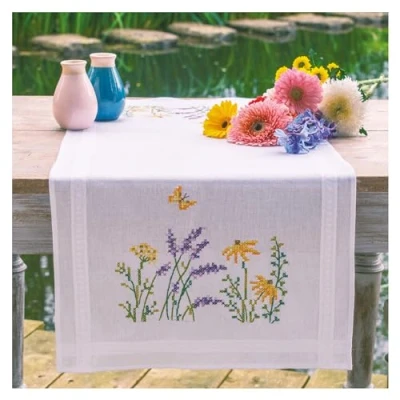 Chemin de table imprimé, avec bord incrusté,, Fabric à broder: 100% cotton, Fil: 100% cotton DMC,, Carte de fils,, Instruction dans huit langues,, Diagramme agrandi,, Aiguille - Photo,, Le dessin imprimé disparaîtra au lavage,, Confectionné,,, Manufacturer: Verachtert