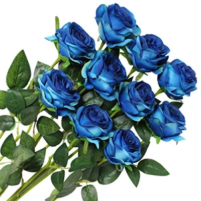 Veryhome 10 Pcs Artificial Roses Silk Flowers Fake Single Stem Blooming Rose Bridal Bouqets For Wedding Home Birthday Party Arrangment Garden Decoration (Blue)