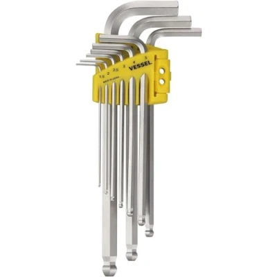 Incl. Hex AF 1.5, 2, 2.5, 3, 4, 5, 6, 8, and 10 mm Magnetized Tip Max Tilting Angle of 38°(Designed Value) by VESSEL's original Hex Ball Point Design High wear-resistance and durable fully hardened wrenches by optimum heat treatment Anti-corrosion Fully Nickel plated Made in Japan by VESSEL