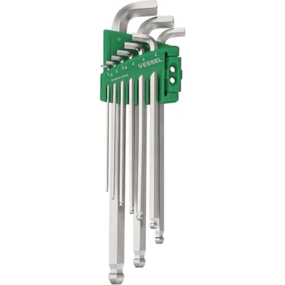 Incl. Hex AF 1.5, 2, 2.5, 3, 4, 5, 6, 8, and 10 mm Magnetized Tip Extra Low-Profile Hex Wrenches with bended angle of 95° for limited work spaces Max Tilting Angle of 38°(Designed Value) by VESSEL's original Hex Ball Point Design High wear-resistance and durable fully hardened wrenches by optimum heat treatment Anti-corrosion Fully Nickel plated / Made in Japan by VESSEL