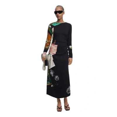 Long-sleeve dress, round neck, asymmetrical hem, side ruching, and Collage-style print. Arty print Fit: Slim Sleeve: Long Length: Midi Closure: Zipper Lenzing EcoVero viscose Model’s measurements: Height: 179 cm; Waist: 59 cm; Hip: 88 cm Model size: S SKU: 25WWVW082000 Product Sustainability Responsibly Sourced Fiber 97% VISCOSE, 3% ELASTANE