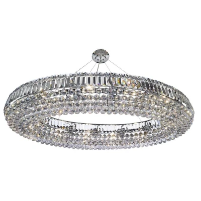 This chrome oval 24 light chandelier with clear crystal coffin drops and balls makes an amazing impact in any room. The majestic, contemporary chandelier is a real statement piece which features a decorative hollow oval of crystal coffin drops and balls, with 24 lights that make the entire piece sparkle at night.