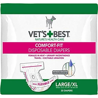 COMFORTABLE - Vet's Best Comfort-Fit Disposable Female Dog Diapers in the Large/Extra Large size fits a 23.5-31.5 inch waist. For best fit, measure dog around narrowest part of waist. If in between sizes, size up. VERSATILE - A perfect, disposable solution for managing your female dog’s urinary incontinence, excitable urination, and heat cycles. Makes traveling with your pet easier. CONFIDENCE - Each Vet’s Best Disposable Female Dog Diaper is manufactured with a wetness indicator. At a glance you will know when it is time to change the diaper. SAFE AND SNUG - Our female dog diapers have fur-safe, repositionable fasteners to give you the best fit every time, while the leak barrier gives you peace of mind. SIMPLE CONVENIENCE - 30 large/extra large disposable female dog diapers per pack.