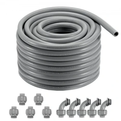 VEVOR 1-Inch Flexible Electrical Conduit, 100 ft, PVC Liquid-Tight Conduit Non-Metallic with 5 Straight and 5 90-Degree Conduit Connector Fittings, for Air Conditioning Motor Controller Pump, IP65Easy InstallationMeet FT1 Flame Retardant StandardsComprehensive Electrical System ProtectionIP65 Waterproof and DustproofAvailable in 3 SizesVarious ApplicationsMax. Adaptable Wire Gauge: 0.87'' (22 mm) O.D.,Length(m): 100 ft (30.5 m),Color: Grey,Item Model Number: PLFNCB-1,Temperature Range: -4°F to 140°F (-20℃ to 60℃),O.D.: 1.3'' (32.77 mm),Net Weight: 26.46 lbs (12 kg),I.D.: 1'' (25.4 mm)