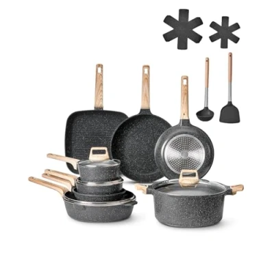 19-Piece Cookware Set: A versatile pots and pans set that includes: 6in sauce pan with lid, 7in sauce pan with lid, 8in frying pan, 9in frying pan, 11in frying pan, 11in saute pan with lid, 11in stockpot with lid, 11in square grill pan, 2 10x10in pan protectors, 3 14x14in pan protectors, silicone spoon, silicone shovel Premium Material: Made with a Maifan stone non-stick coating, this cookware set ensures easy food release and effortless cleaning. The interior withstands temperatures up to 380°C, making it reliable for daily use. The cookware does not include lead, cadmium, and PFOA. Cook with less oil for a healthier meal experience Compatible with All Stovetops: Crafted from 2.5mm thick aluminum, the rv cookware base heats quickly and evenly. The high-magnetic conductive bottom makes it suitable for all stovetops, including gas, electric, and induction Multi-Purpose Cookware: Versatile and functional, this space saving pots set seamlessly transitions from stovetop to grill, and tabletop. Its elegant and modern design enhances the presentation of your dining experience User-Friendly Design: Featuring heat-resistant silicone handles, this kitchen cooking set provides a comfortable grip while preventing burns. The transparent glass lids allow for easy monitoring of your food while cooking. Effortless to clean, it wipes down in seconds, making kitchen maintenance simple