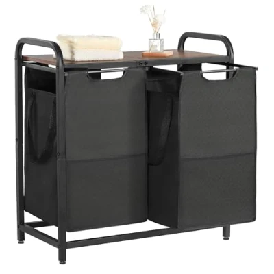 VEVOR 2 Section Laundry Sorter, Large Hamper with Metal Frame and Wooden Tabletop, Freestanding Storage Organizer Baskets Pull Out 600D Oxford Cloth Bags for Dirty Clothes, Bathroom