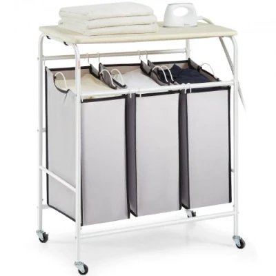 VEVOR 3-Section Laundry Sorter Cart with Ironing Board, Laundry Hamper with Heavy Duty Lockable Wheels and 3 Removable Bag, Rolling Laundry Basket Sorter for Clothes StorageIroning BoardStreamline Your Laundry Routine3 Removable BagsWin in the DetailsEasy AssembleSpace OptimizationCaster Diameter: 1.5 in/38.9 mm,Caster Material: Rubber,Bag Material: Oxford Cloth 600D,Ironing Board Material: MDF,Ironing Board Loading Bearing: 22 lbs/10 kg,Bag Size: 13.8x8.3x22 in/350x210x560 mm,Weight: 14.2 lbs/6.45 Kg,Product Size: 28.5x16.1x35 in/725x410x890 mm,Overall Load Bearing: 50.7 lbs/23 kg,Item Model Number: FW-705DA,Frame Material: Iron + Powder Coating,Bag Load Bearing: 25 lbs/11.4 kg,Ironing Board Size: 28.3x15.9x0.5 in/720x405x12mm,Main Material: Iron, Oxford Cloth