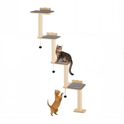 ManoManoGeneral description This VEVOR 4 Tiers Cat Tree is a wall-mounted cat furniture set designed to provide a fun and engaging environment for your feline friends. It includes 4 jumping boards, 4 cat posts, and 3 toy balls, catering to your cat’s needs for climbing, playing, resting, and scratching. Technical specifications Material: E0-grade pine wood Weight capacity: up to 40 lbs (18.14 kg) Platform surface: covered with a plush pad for slip-resistance and softness Installation Includes all necessary accessories and an installation guide Installation process: insert expansion tubes into the wall and secure the boards using screws Designed for easy setup by one person Comes with metal screws, expansion tubes, butterfly anchors, a screwdriver, T-shaped hex screwdriver, and an installation diagram Usage Can be freely arranged to suit different spaces and preferences Minimalist design saves floor space and blends with home decor Suitable for installation in living rooms, bedrooms, or patios