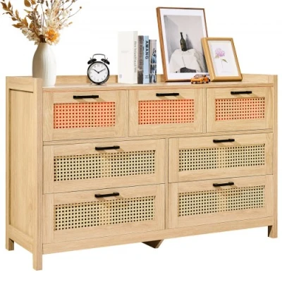 VEVOR 7 Drawer Rattan Dresser, Natural Rattan Wood Dressers with LED Light, Modern Wood Chest Clothing Organizer & Storage Boho Dresser with Sturdy Handles & Legs, for Bedroom, Living Room & HallwayAmple Storage SpaceSeven light colorsSturdy & StylishUser-Friendly DesignVersatile StyleHassle-Free MaintenanceSmall Drawer Size: 14.4 x 12.8 x 7.5 in / 365 x 324 x 190 mm,Color: Natural Wood Color,Load Capacity of Each Drawer: 10 lbs / 4.53 kg,Product Weight: 77.60 lbs / 35.2 kg,Big Drawer Size: 21.7 x 12.8 x 7.5 in / 550 x 324 x 190 mm,Load Capacity of the Tabletop: 30 lbs / 13.6 kg,Item Model NUmber: SR247181,Product Size: 46.69 x 29.53 x 16.34 in / 1186 x 750 x 415 mm