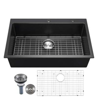 Granite Composite Kitchen Sink: The kitchen sink in black with quartz & resin blend offers a non-porous matte finish and natural stone texture. Its durable, scratch-resistant and easy-cleaning construction simplifies household tasks Multi-Part Kit for Granite Kitchen Sink: Grid reduces scratch and dampens noise; drain kit with filters catches debris for rapid water flow; silicone stopper forms a tight seal, keeping the top mount kitchen sink fresh and cutting standing water Fit Pans & Dishes Effortlessly: 33x22x9 inch single bowl farmhouse basin fits large pots, baking sheets & dishes. 10mm basin & 15mm reinforced edges enhance stability & reduce splashes. The bar sink is ideal for compact kitchens, space-saving Precise Template Installation: The drop-in basin fits cabinets as small as 35x24 inch with 32x21 inch recommended cutout. Includes a template for precise prep kitchen sink alignment. Follow the guide for single bowl kitchen sinks setup Arrives Intact & Complete: The small kitchen sink is shielded by double-wall cartons, EPE foam, passed stacking/vibration/drop tests. Includes: Granite Kitchen Sink x1, Drain Set x1, Grid x1, Parts Set x1, Hole Template x1, Manual x1