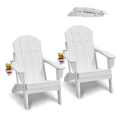 Foldable Design: This plastic Adirondack chair folds for easy storage and transport, fitting neatly into garages, storage rooms, and more. Note: Color may slightly vary in different lighting. Easy Assembly: With precise pre-drilled holes (tolerance ≤0.019in), assembly takes just 15 minutes using a power screwdriver. Includes 8 parts and 2 accessory packs with clear instructions. Heat and Water Resistant: The folding adirondack chairs are made from high-quality HDPE plastic, it resists heat, water, and various weather conditions without warping, cracking, or rotting. Perfect for patios, gardens, pools, beaches, and porches. Spacious Comfort: Measures 31.5×29.7×36.0 inches, with a wider seat and curved backrest. The 105° tilt angle offers deep seating for effective spine relaxation and fatigue relief. Supports up to 400 lbs, suitable for adults and larger individuals. Thoughtful Details: The wide armrests provide natural arm support, and the built-in cup holder accommodates most outdoor cups for convenience. For easy cleaning, simply wipe with a cloth to keep it looking like new, making it perfect for long-term outdoor use.