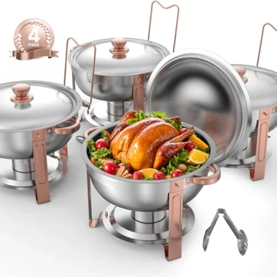 VevorVEVOR Chafing Dish Buffet Set, 5 Qt 4 Pack, Stainless Steel Chafer with 4 Full Size Pans, Round Catering Warmer Server with Lid Water Pan Folding Stand Clip, for Weddings Parties Banquets, Rose GoldLarge Space to ServeFood Grade MaterialKeep Food Warm & ReadyLid HolderGiven Thoughtful ToolWide ApplicationFood Pan Capacity: ≥5Qt / 4.7L,Water Pan Capacity: ≥7Qt / 6.6L,Color: Rose Gold,Item Model Number: HZ-831,Product Weight: 23.6 lbs / 10.7 kg ±5 %,Quantity: 4,Material: Stainless Steel,Heating Method: Fuel