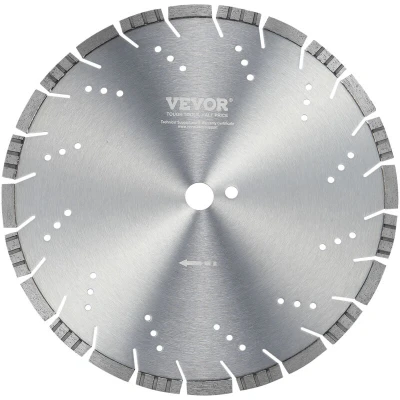 VevorVEVOR Diamond Blade, 14inch/350mm Concrete Saw Blade Wet or Dry, 0.47inch/12mm Slanted Teeth Diamond Segment Blade, Universal 1 inch/25.4 mm Center Hole Diameter, for Concrete Cement Board Tile BrickHigh-Durability MaterialsLonger LifespanSafe and Tooth-Damage FreeMulti-Purpose UseStrong CompatibilitySuitable for Dry and Wet CuttingOuter Diameter: 14 inch / 350 mm,Segment Blade Height: 0.47 inch / 12 mm,Package Dimensions: 15.35 x 15.35 x 0.47 inch / 390 x 390 x 12 mm,Item Model Number: XMF350124464XFH,Product Weight: 4.34 lbs / 1.97 kg,Quantity: 1 Piece,Main Material: 30Cr-Mo + Diamond,Tooth Type: Slanted Teeth,Center Hole Diameter: 1 inch / 25.4 mm